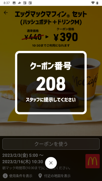 なぜ朝マックのクーポンが無いのか不明ですが、今後に期待しましょう。